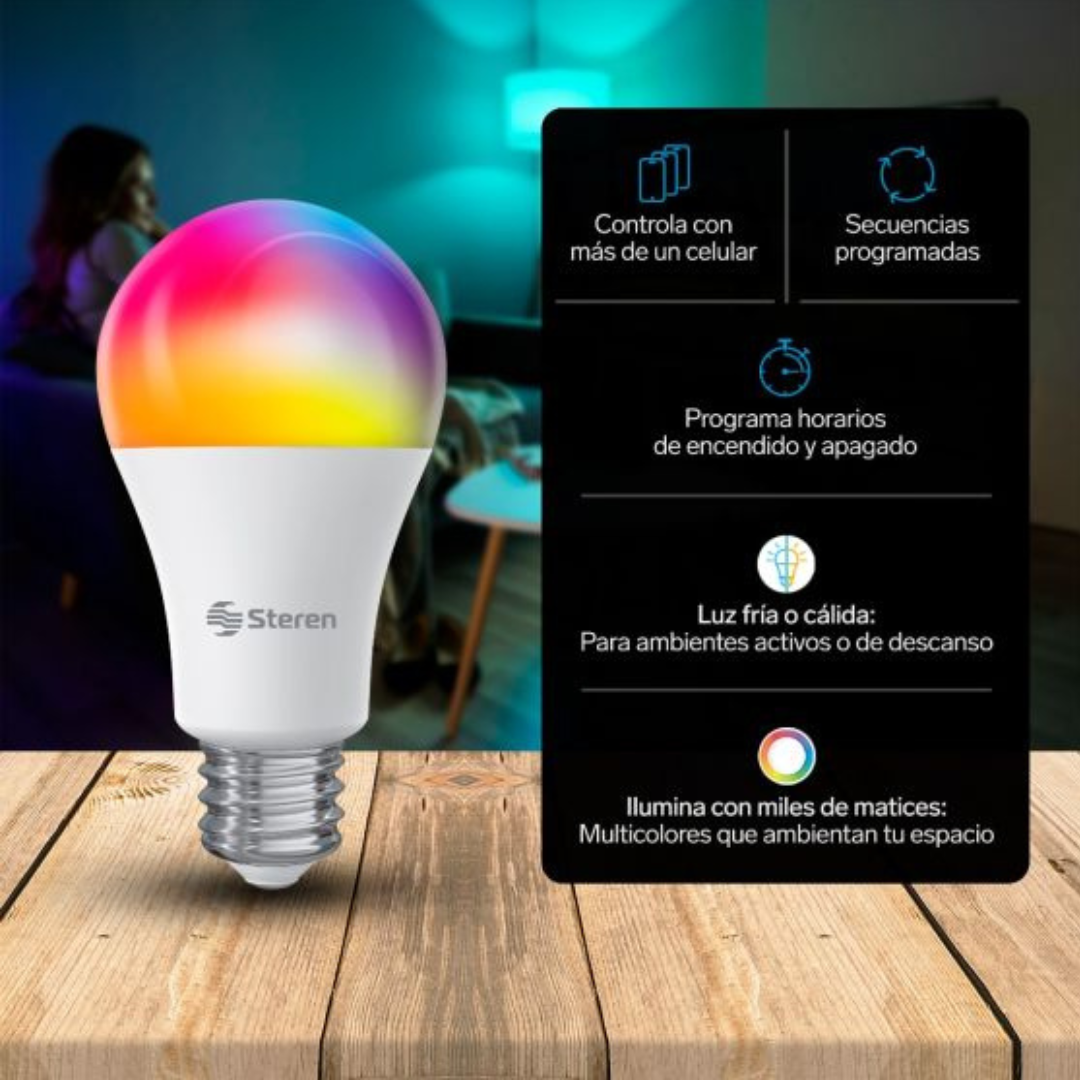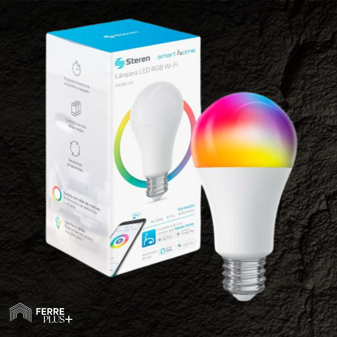 Mejora tu hogar con el foco LED Wi-Fi multicolor de 10W de Steren. Fácil de usar, eficiente y compatible con Alexa y Google Assistant para un control total.