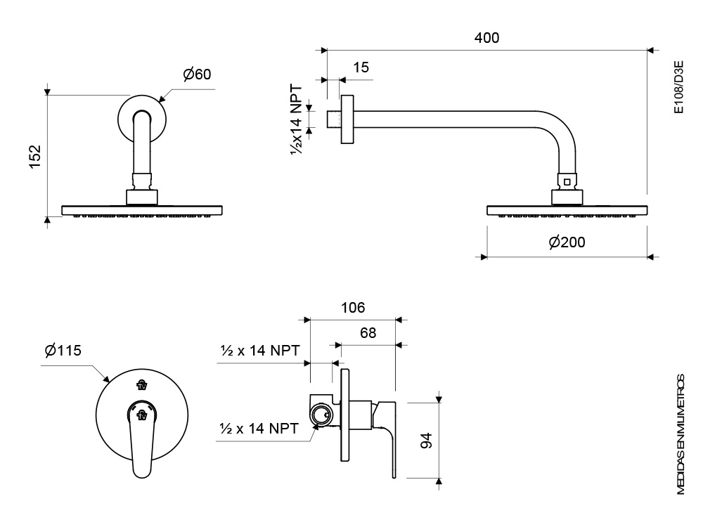– Brazo de ducha fabricado en aleación de cobre y zinc (latón).
